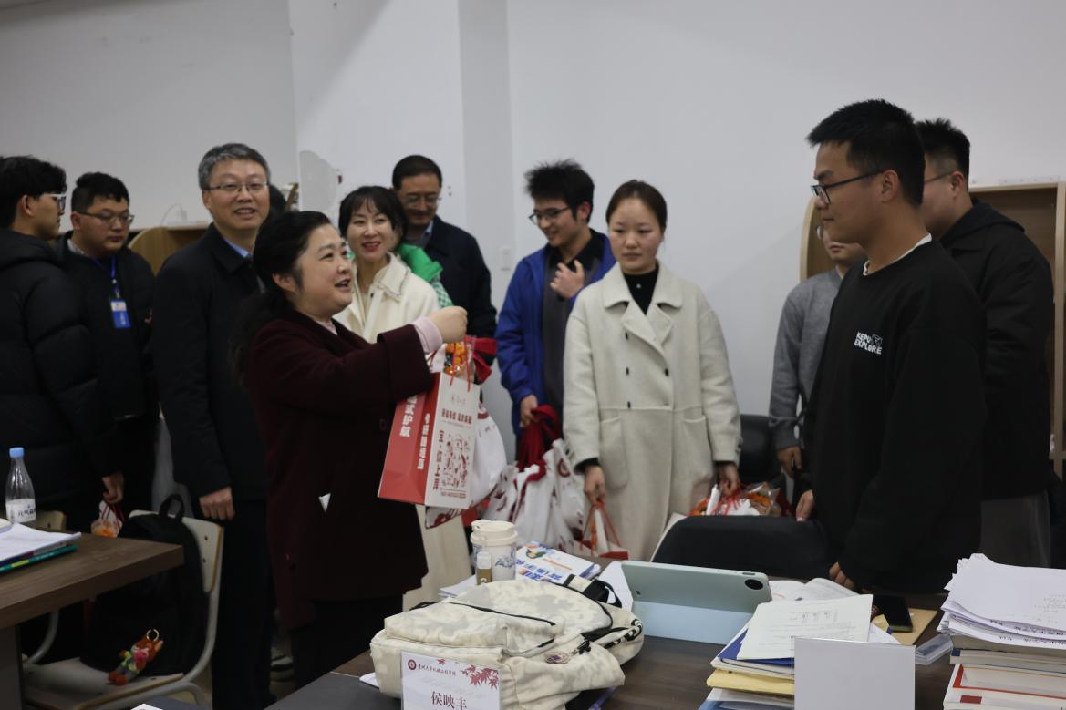 时值考研冲刺关键阶段,自习室内学习氛围浓厚。校领导一行轻声走入,亲切问候正在埋头复习的同学们。杨未、向嵩等领导与老师们一同将精心准备的“考研暖心包”递到学生手中。暖心包内配有暖手宝、考研文具、护眼贴等实用物品,寄托着学校对学生的细致关怀。同学们接过礼物,向领导老师表示感谢,现场气氛温馨。
