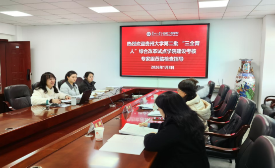2026年1月8日,贵州大学机械工程学院“‘智’造天地创新赋能——‘三全育人’综合改革试点工作成果验收评审会”在学院顺利举行。由三位校内专家组成的验收评审组,对我院“三全育人”综合改革试点工作成果进行专项验收,经严格评审,我院试点建设工作圆满通过验收,考核合格。