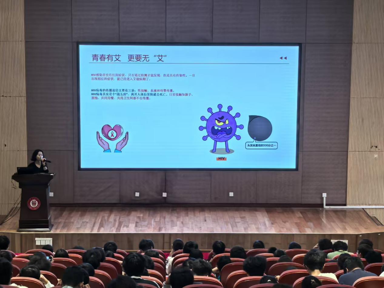 大会第二阶段,学生科辅导员杨朵老师开展防艾宣传,从艾滋病的传播途径、预防措施、等方面进行讲解,着重强调树立健康观念、提高自我保护意识的重要性,引导新生们科学认识艾滋病,养成良好的生活习惯,远离高危行为。同时,辅导员杨朵老师还向新生们介绍校医院公众号的重要栏目及使用方法,方便新生日后随时获取医疗健康服务保障。