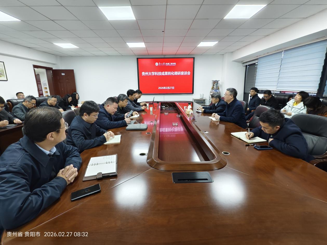 2026年2月27日,贵州大学校领导带队赴我院开展科技成果转化调研座谈会,与我校工科学院主要负责人进行面对面交流,倾听学院在成果转化工作中的实践探索、实际困难与意见建议,为学校“十五五”开局之年科技成果转化工作提质增效明确方向、凝聚合力。