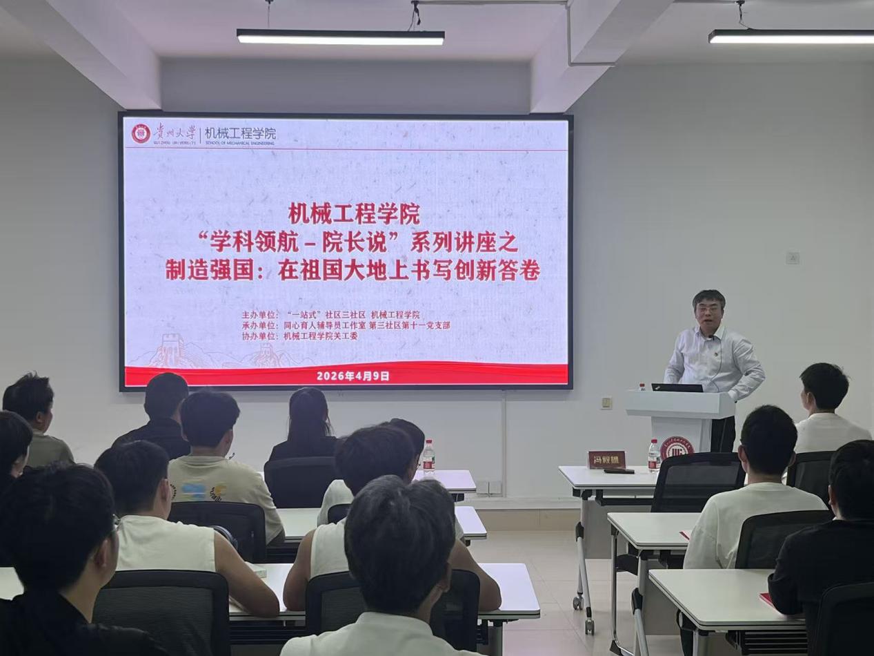 为落实立德树人根本任务,推进“一站式”学生社区育人改革,4月9日,贵州大学机械工程学院在西校区6栋“一站式”学生社区举办制造强国主题讲座。讲座由机械工程学院冯毅雄院长主讲,以“两弹一星”奋斗史和机械学科发展为主线,系统阐述国家工业振兴、科技自强之路,勉励学生将个人成长融入制造强国伟业。